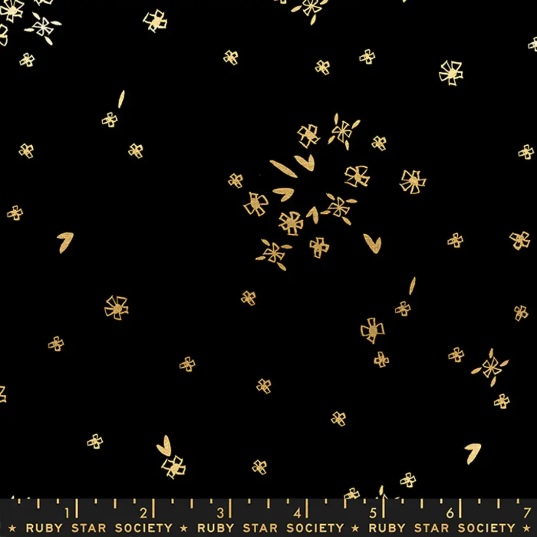 A lovely solid black background with golden flowers and other small shapes. Quilting fabric by Moda.